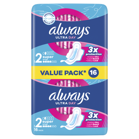 Enjoy triple protection offered by ALWAYS Ultra Day Super (size 2) sanitary pads with wings. Always pads with an absorbent and soft top layer absorb moisture in seconds thanks to InstantDry technology, and LeakGuard and OdourLock technologies prevent leaks and unpleasant odours. The unique ComfortLock wings are designed to fit better to any type of underwear. For extra night protection try Always Night sizes. Always Ultra pads are dermatologically approved by the Skin Health Alliance.