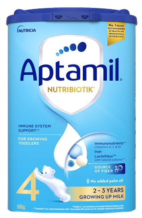 Aptamil® 4 milk drink. Promotes the normal functioning of the immune system *. Innovative research on breast milk has been carried out for more than 50 years. Aptamil® 4 contains important nutrients **, including vitamins * naturally found in breast milk and our unique fiber blend. Without added palm oil. Aptamil® 4 and no. 1 brand recommended by Latvian healthcare professionals (Survey of healthcare professionals in Latvia, Nielsen, 2019, N = 101).