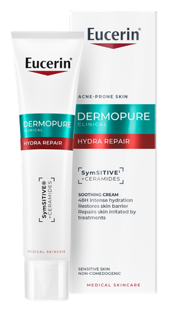 Eucerin DermoPure Clinical Hydra Repair Soothing Cream is clinically proven to repair the skin barrier while using drying acne medications. With Symsitive™ and ceramides to instantly reduce stinging, burning and itching.