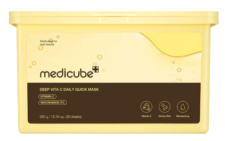 Medicube Deep Vita C Daily Quick Mask is a brightening care cellulose mask infused with potent vitamins, designed to target various skin concerns. These masks deliver quick and effective results in just 1 minute, providing a boost to your skincare routine. Witness remarkable improvements after just 1 minute of use, including a 41.1% increase in skin radiance, a 0.6% improvement in dull skin tone, a 2.4% decrease in temporary skin redness, and a -20.66°F reduction in skin temperature. Revitalize your skin tone and enhance radiance in a mere 1 minute with our powerful formula. Features - Quick brightening effects - Improved radiance and makeup adherence - Environmentally friendly value package Key Ingredients: Niacinamide (Vitamin B3): Helps improve skin texture, the look of pores, reduce the look of fine lines, and brighten skin tone. Acetyl Glucosamine: Amino sugar that helps to brighten the skin, care for hyperpigmentation visibility and skin elasticity. Vitamin A + Vitamin B5 + Vitamin E: Triple vitamin complex. Helps protect the skin from free radical damage, providing soothing care for skin. Sea Buckthorn Extract (Hippophae Rhamnoides Water): Derived from sea buckthorn berries. Rich in antioxidants and vitamins, providing nourishment and protection to the skin, and helping to maintain skin hydration.