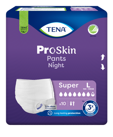 TENA ProSkin Pants Night are white, soft and comfortable night-time urine-absorbing panties that can be worn in the same way as regular underwear panties. TENA ProSkin Pants Night provide greater protection in the supine position - with greater absorbency at the back, which is essential when lying down, and a highly absorbent double inner layer that absorbs fluid quickly, preventing leaks and ensuring safety all night long. These innovative urine-absorbing panties developed by TENA help keep skin dry and protected for longer. The disposable night product, which fits close to the body and is suitable for men and women, stays in place even when moving and rotating. TENA ProSkin Pants Night is characterized by excellent absorption, even in the presence of larger urine leaks, moisture is quickly and effectively removed from the skin to the deepest layers of the product, which guarantees safety against leaks overnight. Panties made of soft, breathable materials promote skin health and are suitable for moderate to severe urinary incontinence at night. Enjoy a better night's sleep with TENA ProSkin Pants Night.