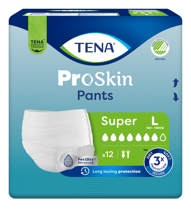 TENA ProSkin Pants Super L (designed for users with a hip circumference of 80 to 110 cm) are soft and comfortable panties for men and women for urinary incontinence, for day and night use. Unlike conventional adult panties, TENA ProSkin Pants features advanced moisture-reducing technologies that provide high absorption, protection against leaks and odors. For complete safety, FeelDry Advanced quickly removes fluid from the surface, while the quick-absorbing center instantly turns on even large amounts of urine, so moisture does not stay on the skin and helps keep skin healthy. These disposable panties are made of fabric-like breathable materials that have excellent absorbency. As underwear, panties promote an independent and active daily life. A wide range of TENA ProSkin Pants in different absorbencies and sizes is available.
