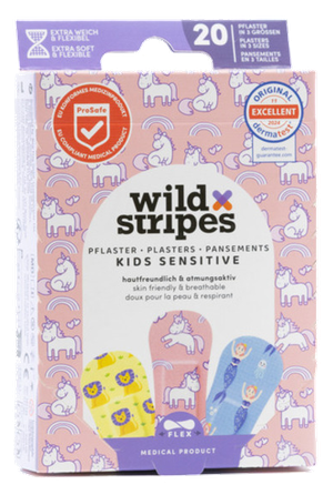 Adventures full of fantasy and safe protection! Wild Stripes Kids Sensitive Fantasy plasters are EU compliant medical devices that provide reliable protection for small cuts and scratches. They are hypoallergenic, gentle on the skin, and ensure particularly good adhesion, as well as effective protection against dirt and bacteria. The plasters are water-resistant, suitable for use up to 24 hours, and can be removed completely painlessly. With creative designs and patented shapes, they make every wound safe and stylish.