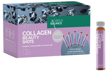 <p>Kolagēns ir olbaltumviela, kas dabiski tiek sintezēta cilvēka ķermenī. Šī olbaltumviela ir viens no svarīgākajiem ādas elementiem un veido vairāk nekā 70 % ādas svara. Arī hialuronskābe dabiski atrodas cilvēka organismā. Kolagēnam un hialuronskābei ir nozīmīga loma saistaudu struktūras veidošanā.</p><ul><li>Biotīns palīdz uzturēt ādas un matu veselību.</li><li>Cinks palīdz uzturēt ādas, matu un nagu veselību.</li><li>Cinks un C vitamīns veicina šūnu aizsardzību pret oksidatīvo stresu.</li><li>C vitamīns veicina normālu kolagēna veidošanos, kas nepieciešams normālai asinsvadu, skrimšļu, kaulu, ādas, zobu un smaganu darbībai.</li></ul><p><br></p><p>Kāpēc izvēlēties Collagen Beauty Shots?</p><ul><li>Sastāvā ir aktīvās vielas, kas vienlaikus atbalsta ādas, matu un nagu veselību</li><li>Ērta lietošana – gatavs šķidrā formā, ideāli piemērots aizņemtam ikdienas ritmam.</li><li>C vitamīns veicina dabisku kolagēna veidošanos, savukārt antioksidanti palīdz aizsargāt šūnas no oksidatīviem bojājumiem.</li></ul>