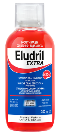 Eludril Extra antibakteriāls mutes skalojamais līdzeklis ar ilgstošu antibakteriālu iedarbību līdz pat 12 stundām.