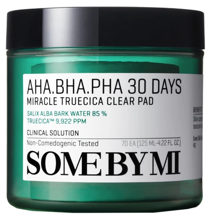 SOME BY MI AHA BHA PHA 30 Days Miracle Truecica Clear Pad ir daudzfunkcionāls ādas kopšanas līdzeklis, kas piedāvā ērtu risinājumu ādas attīrīšanai, pīlingam un nomierināšanai vienā solī. Šie spilventiņi ir piepildīti ar SOME BY MI populārās 30 Days Miracle līnijas esenci, kas ietver AHA, BHA, PHA skābes, kā arī Truecica™ kompleksu, lai nodrošinātu dziļu attīrīšanu un intensīvu nomierināšanu. AHA skābes palīdz nolobīt atmirušās ādas šūnas un izlīdzina ādu, savukārt BHA skābes iekļūst dziļi porās, lai noņemtu netīrumus un lieko eļļu. PHA skābes atbalsta ādas mitruma līdzsvaru un mazina kairinājumu. Truecica™ kompleksam, kas satur centella asiatica ekstraktu un tējas koka eļļu, ir nomierinoša iedarbība, palīdzot mazināt iekaisumu un uzlabot ādas veselību.