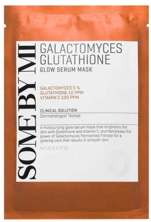 SOME BY MI Galactomyces Glutathione Glow Serum Sheetmask – lokšņu sejas maska, kas nodrošina ādai mitrumu un mirdzumu. Sastāvā esošais vitamīnu un minerālvielu komplekss baro un atdzīvina ādu, savukārt glutations aizsargā pret brīvajiem radikāļiem, samazina pigmenta plankumus un padara ādu gaišāku. Niacinamīds arī palīdz cīnīties ar nevienmērīgu ādas toni un lieko tauku daudzumu.