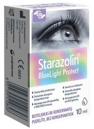 Starazolin BlueLight Protect ir medicīniska ierīce oftalmoloģiskai lietošanai. Tas ir sterils, vidēji viskozs, fizioloģisks un izoosmotisks šķīdums bez konservantiem, un tā sastāvā ir hialuronskābe, rozmarīnskābe un B12 vitamīns.