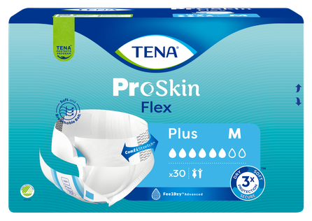 TENA Flex Plus ir elastīgas jostbikses, kas izstrādātas, lai tās būtu vieglāk un ergonomiskāk nomaināmas. Tās ir piemērotas cilvēkiem, kas pārvietojas, ir mazkustīgi vai guloši. TENA ProSkin Flex ar FeelDry Advanced™ slāni nodrošina izcilu aizsardzību, ātri aizvadot šķidrumu prom no virskārtas un saglabājot ādu sausu. Īpaši ātri uzsūcošais slānis momentāni uzsūc pat lielu daudzumu urīna, efektvīvi novada to produkta dzīļakajos slāņos, nodrošinot sausuma sajūtu. Pilnīgi elpojošs ConfioAir™ ārējais slānis ļauj ādai brīvi elpot. Visas šīs priekšrocības saudzē ādu. ComfiStretch josta nodrošina pielāgošanas iespējas vēl lielākam komfortam un labākai aizsardzībai. Lai jostbikses būtu vieglāk izmantojamas, jostai ir viegli fiksējami klipši, kurus var droši piefiksēt, pielāgojot izstrādājumu auguma aprisēm.