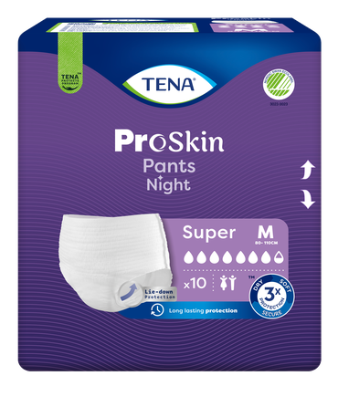 TENA ProSkin Pants Night ir baltas, mīkstas un ērtas naktī lietojamas urīnu uzsūcošās biksītes, kas nēsājamas tāpat kā parastās apakšveļas biksītes. TENA ProSkin Pants Night nodrošina lielāku aizsardzību guļus stāvoklī – ar lielāku uzsūktspēju aizmugurē, kas ir būtiski, atrodoties guļus stāvoklī, un īpaši uzsūcošu dubultu iekšējo slāni, kurā ātri iesūcas šķidrums, novēršot noplūdes un nodrošinot drošību visas nakts laikā. Šīs inovatīvās TENA izstrādātās urīnu uzsūcošās biksītes palīdz saglabāt trauslai ādai sausumu un aizsardzību ilgāku laiku. Cieši ķermenim piegulošais, vīriešiem un sievietēm piemērotais vienreizlietojamais nakts iztrādājums paliek vietā, arī kustoties un grozoties. TENA ProSkin Pants Night raksturo izcila absorbcija pat tad, ja ir lielākas urīna noplūdes, mitrums tiek ātri un efektīvi aizvadīts no ādas uz izstrādājuma dziļākajiem slāņiem, tas garantē drošību pret noplūdēm visu nakti. No mīkstiem, gaisa caurlaidīgiem materiāliem izgatavotās biksītes veicina ādas veselību un ir piemērotas vidējas un stipras pakāpes urīna nesaturēšanai nakts laikā. Baudiet labāku miegu naktī ar TENA ProSkin Pants Night.