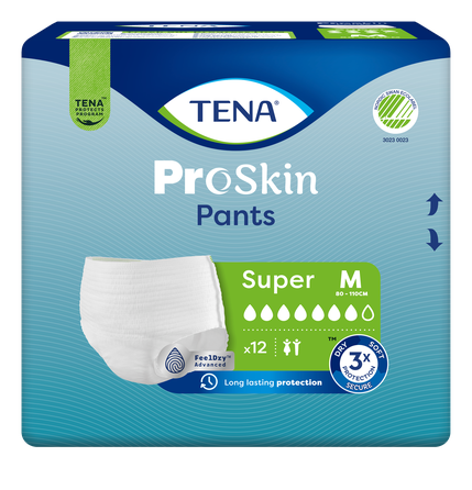 TENA ProSkin Pants Super M (paredzētas lietotājam ar gurnu apkārtmēru no 80 līdz 110 cm) ir mīkstas un ērtas vīriešiem un sievietēm piemērotas biksītes ūrīna nesaturēšanas gadījumiem, lietojamas dienā un naktī. Atšķirībā no parastajām pieaugušo biksītēm TENA ProSkin Pants raksturo uzlabotas mitrumu samazinošas tehnoloģijas, kas nodrošina augstu uzsūktspēju, aizsardzību pret noplūdēm un smakām. Pilnīgai drošībai FeelDry Advanced™ ātri aizvada šķidrumu no virsmas, savukārt ātri uzsūcošā vidusdaļa uzreiz ieslēdz pat lielus urīna daudzumus, tādējādi mitrums nepaliek uz ādas un tas palīdz uzturēt ādu veselu. Šīs vienreizlietojamās biksītes ir izgatavotas no audumam līdzīgiem gaiscaurlaidīgiem materiāliem, kam ir izcila uzsūktspēja. Kā apakšveļa uzvelkamās biksītes veicina patstāvīgu un aktīvu ikdienas dzīvi. Pieejams plašs klāsts atšķirīgas uzsūktspējas un dažādu izmēru biksīšu TENA ProSkin Pants.