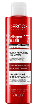 JAUNUMS: pirmais īpaši atjaunojošais DERCOS matu un galvas ādas kopšanas līdzeklis. Bagātināts ar citronskābi un prokolagēna peptīdiem, kas stiprina matu šķiedras (4) un nepieļauj matu izkrišanu trausluma dēļ. ŠAMPŪNS lieliski attīra un spēcina matus no saknēm līdz galiem, piešķirot tiem redzamu apjomu. PIERĀDĪTA EFEKTIVITĀTE: PAR 97% STIPRĀKI MATI (1) PAR 53% LIELĀKS APJOMS (3) Piemērots visu veidu matiem. Dermatoloģiski testēts. (1) Instrumentāls tests pēc līdzekļa pirms šampūna lietošanas, šampūna un kondicioniera lietošanas. (3) Instrumentāls tests. (4) Sastāvdaļu in vitro tests.