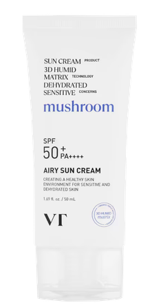 <div>VT Airy Sun Cream ir atsvaidzinošs, elpojošs saules aizsargkrēms, kas izstrādāts dehidrētai un jutīgai ādai. Formulēts ar 3D Humid Matrix un Moist Blending EX tehnoloģiju, šis trīskāršas iedarbības krēms nodrošina SPF 50+ PA++++ aizsardzību, vienlaikus nomierinot, mitrinot un izlīdzinot ādas toni – neatstājot baltu nosēdumu.</div><div><br></div><div><span style="font-weight: bold;">Galvenās priekšrocības:</span></div><div><br></div><div>Trīskāršas iedarbības formula: UV aizsardzība, ādas izgaismošana un pretgrumbu kopšana.</div><div><br></div><div>Elpojoša, īpaši viegla tekstūra jutīgai un dehidrētai ādai.</div><div><br></div><div>Klīniski pārbaudīta SPF 50+ PA++++ aizsardzība pret sauli.</div><div><br></div><div>Neatstāj baltu kārtiņu – ideāli piemērots lietošanai zem grima.</div><div><br></div><div>Nomierinoša un mitrumu pastiprinoša formula komfortam visas dienas garumā.</div><div><br></div><div><span style="font-weight: bold;">Galvenās sastāvdaļas:</span></div><div><br></div><div>Moist Blending EX: trešās paaudzes mitrināšanas tehnoloģija uz sniega sēnes bāzes, kas spēj noturēt līdz pat 1000 reizēm vairāk mitruma par savu svaru.</div><div><br></div><div>3D Humid Matrix: ilgstošas mitruma noturēšanas sistēma, kas noslēdz mitrumu ādas barjerā.</div><div><br></div><div>Pantenols: palīdz aizsargāt un stiprināt ādas aizsargbarjeru.</div><div><br></div><div>Skvalāns: novērš mitruma zudumu un uztur veselīgu ādas vidi.</div><div><br></div><div>Saccharomyces fermentācija un sēņu ekstrakti: dabiskas izcelsmes nomierinošas un ar antioksidantiem bagātas sastāvdaļas.</div><div><span style="font-weight: bold;"><br></span></div><div><span style="font-weight: bold;">Kam paredzēts:</span></div><div><br></div><div>Ideāli piemērots jutīgai, kairinātai vai sausai ādai. Lieliska izvēle tiem, kas meklē nomierinošu, ne-taukainu saules aizsargkrēmu, kas labi klājas zem grima un nodrošina starojošu rezultātu bez baltas kārtiņas.</div>