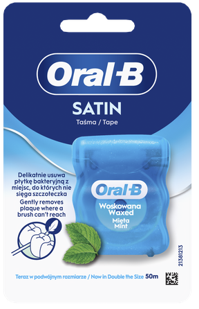 Tīriet starp zobiem efektīvi ar Oral-B Satin Tape. Šis vaskotais zobu diegs maigi slīd starp zobiem pat šaurās vietās, pateicoties tā satīnam līdzīgajai struktūrai un tekstūrai. Tas palīdz tīrīt vietas, kurām nevar piekļūt tikai ar zobu birsti vien, tādējādi samazinot aplikumu. Šis platais zobu diegs var palīdzēt vieglāk tīrīt starp zobiem, un to var izmantot gan no rīta, gan vakarā kā daļu no mutes dobuma higiēnas rituāla, lai uzturētu veselīgas smaganas un zobus.