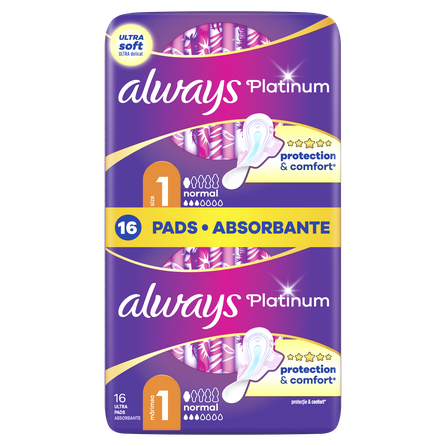 Гигиенические прокладки Always Platinum с крылышками ComfortLock разработаны для лучшего прилегания и обеспечивают почти стопроцентную защиту от протеканий, смещения и дискомфорта. С гигиеническими прокладками Always Platinum менструация будет вас беспокоить меньше всего. При легком или умеренном кровотечении в течение дня рекомендуется использовать Always Platinum Normal с крылышками размер 1. Попробуйте Always Platinum Secure Night Extra размер 5 которые являются лучшими гигиеническими прокладками Always Platinum для ночной защиты. По сравнению с предыдущим продуктом