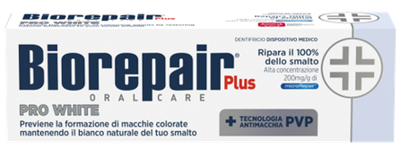 Отбеливающая зубная паста BIOREPAIR® Pro White не только позволяет вернуть зубам естественную белизну, но и как все пасты Biorepair, эффективно восстанавливает целостность эмали. Секрет действия пасты кроется в применении специальной формулы MicroRepair, состоящей из цинк-гидроксиапатита и PVP-полимера, который образует на поверхности зубов нано-плёнку, предотвращающую окрашивание от кофе, чая, красного вина и т.д. МicroRepair® микрочастицы, заполняют микротрещинки, восстанавливают и укрепляют структуру зубной эмали, предотвращая развитие кариеса. В качестве антибактериального компонента паста содержит натуральный ксилит.