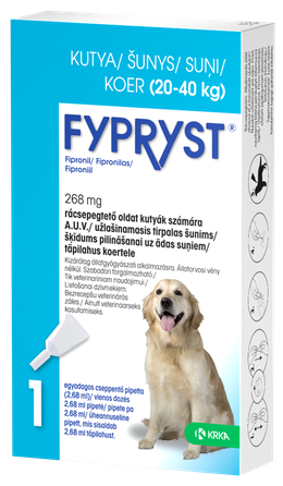 <p>Blusu (Ctenocephalides felis) un ērču (Rhipicephalus sugas, Dermacentor sugas, Ixodes sugas) invāzijas ārstēšana un profilakse suņiem.</p><p>Alerģijas pret blusu kodumiem ārstēšana un kontrole suņiem (blusu kodumu alerģijas).</p><p>Utu (Trichodectes canis) invāzijas profilakse un ārstēšana suņiem.</p> <a href="https://registri.pvd.gov.lv/vz/dati?o_n=fypryst+268&r_n=10">Veterināro zāļu reģistrs</a>