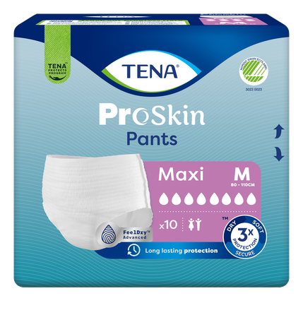 <p style="text-align:justify;">TENA Pants ProSkin Maxi M (paredzētas lietotājam ar gurnu apkārtmēru no 80 līdz 110 cm) ir mīkstas un ērtas vīriešiem un sievietēm piemērotas biksītes urīna nesaturēšanas gadījumiem, lietojamas dienā un naktī. Atšķirībā no parastajām pieaugušo autiņbiksītēm TENA ProSkin Pants raksturo uzlabotas mitrumu samazinošas tehnoloģijas, kas nodrošina augstu uzsūktspēju, aizsardzību pret noplūdēm un smakām. Pilnīgai drošībai FeelDry Advanced™ ātri aizvada šķidrumu no virsmas, savukārt ātri uzsūcošā vidusdaļa uzreiz ieslēdz pat lielus urīna daudzumus, tādējādi mitrums nepaliek uz ādas un tas palīdz uzturēt ādu veselu. Šīs vienreizlietojamās biksītes ir izgatavotas no audumam līdzīgiem gaiscaurlaidīgiem materiāliem, kam ir izcila uzsūktspēja. Kā apakšveļa uzvelkamās biksītes veicina patstāvīgu un aktīvu ikdienas dzīvi. Pieejams plašs klāsts atšķirīgas uzsūktspējas un dažādu izmēru biksīšu TENA ProSkin Pants.</p>