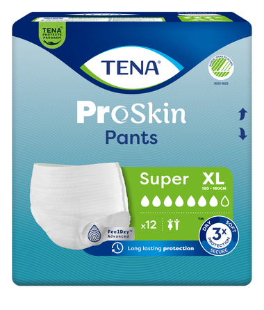 <p style="text-align:justify;">TENA ProSkin Pants Super XL (paredzētas lietotājam ar gurnu apkārtmēru no 120 līdz 160 cm) ir mīkstas un ērtas vīriešiem un sievietēm piemērotas biksītes uzrīna nesaturēšanas gadījumiem, lietojamas dienā un naktī. Atšķirībā no parastajām pieaugušo biksītēm TENA ProSkin Pants raksturo uzlabotas mitrumu samazinošas tehnoloģijas, kas nodrošina augstu uzsūktspēju, aizsardzību pret noplūdēm un smakām. Pilnīgai drošībai FeelDry Advanced™ ātri aizvada šķidrumu no virsmas, savukārt ātri uzsūcošā vidusdaļa uzreiz ieslēdz pat lielus urīna daudzumus, tādējādi mitrums nepaliek uz ādas un tas palīdz uzturēt ādu veselu. Šīs vienreizlietojamās biksītes ir izgatavotas no audumam līdzīgiem gaiscaurlaidīgiem materiāliem, kam ir izcila uzsūktspēja. Kā apakšveļa uzvelkamās biksītes veicina patstāvīgu un aktīvu ikdienas dzīvi. Pieejams plašs klāsts atšķirīgas uzsūktspējas un dažādu izmēru biksīšu TENA ProSkin Pants.</p>